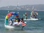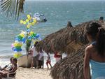 Cherie and Anne at the annual "Blessing of the pangas" in Bucerias, Mexico. The pangas line up just outside the breaking waves, waiting for a chance to charge the beach. Each panga, or fishing boat is draped in ribbons, balloons and paper flowers. The entire town of Bucerias (and surrounding towns) gather on the beach to celebrate the blessing of the pangas. Pangas line up until they blend in with the haze of the horizon. Little angels pay respects the the Virgin Mary and the Baby Jesus (who is represented by a doll.) Pangas and palm fronds. Balloon crosses and paper flowers adorn the fishing vessels. Everywhere you look there are pangas coming and going. It's smart to wait for a lull in the swell. A little girl watches from a distance as the pangas burst onto the shore. That swell is not so swell. The crowd rushes to help each panga as it barges up the beach. Getting your panga on the beach is only half the battle--then you have to get it back out. A wave of color floats across the bay. A sailor takes a closer look. In Bucerias, there is standing room only. The panga is blessed! Now go out and catch some fish! Pangas brave the surf. It appears that the fishing fleet has beached itself. The view through the balloons. Full speed ahead! Friends gather around the panga. The excitement is contagious. The blessing of the pangas is much more exciting than the crowd's expressions suggest. Ready or not...here we come! Little girls dressed in white for their first communion. The beach is drenched in color and enthusiasm. Exploring Bucerias together. The town follows the priest, "Mary", and her angels to church. After a safe panga landing, "Mary" carried "Baby Jesus" up the beach. Bucerias celebrates with plenty of music, food, rides and laughter. The town square is packed. More wheel barrel snacks. (There has to be a better way to provide munchies.) Lunch in Bucerias. Anne finds a lucky horse-shoe. Don't let your luck run out. Brain tacos, anyone? I have a special affinity for these palm trees. Caballeros waiting for the port-a-potties. The view from the stage. Bucerias carnival ride. The crowds in Bucerias for the annual panga blessing. Bucerias town square. Click on each picture to see it full size.